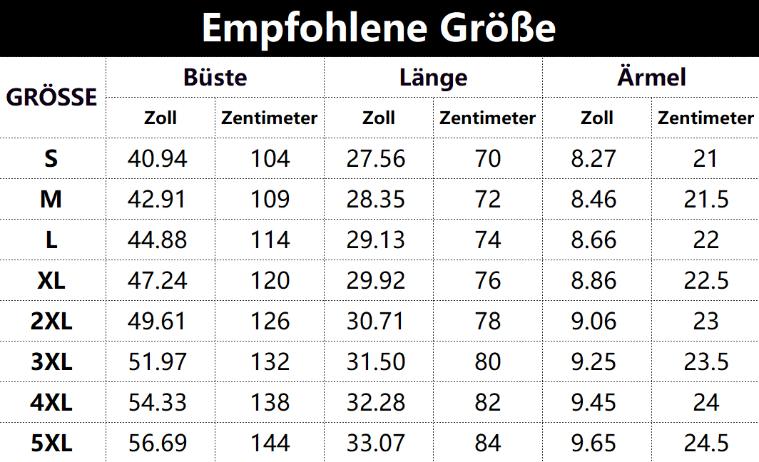 • Vorschlag: *Diese Daten wurden aus der manuellen Messung des Produkts erhalten, es kann um 0,03-0,06 ZOLL/1-3 CM aus geschaltet sein